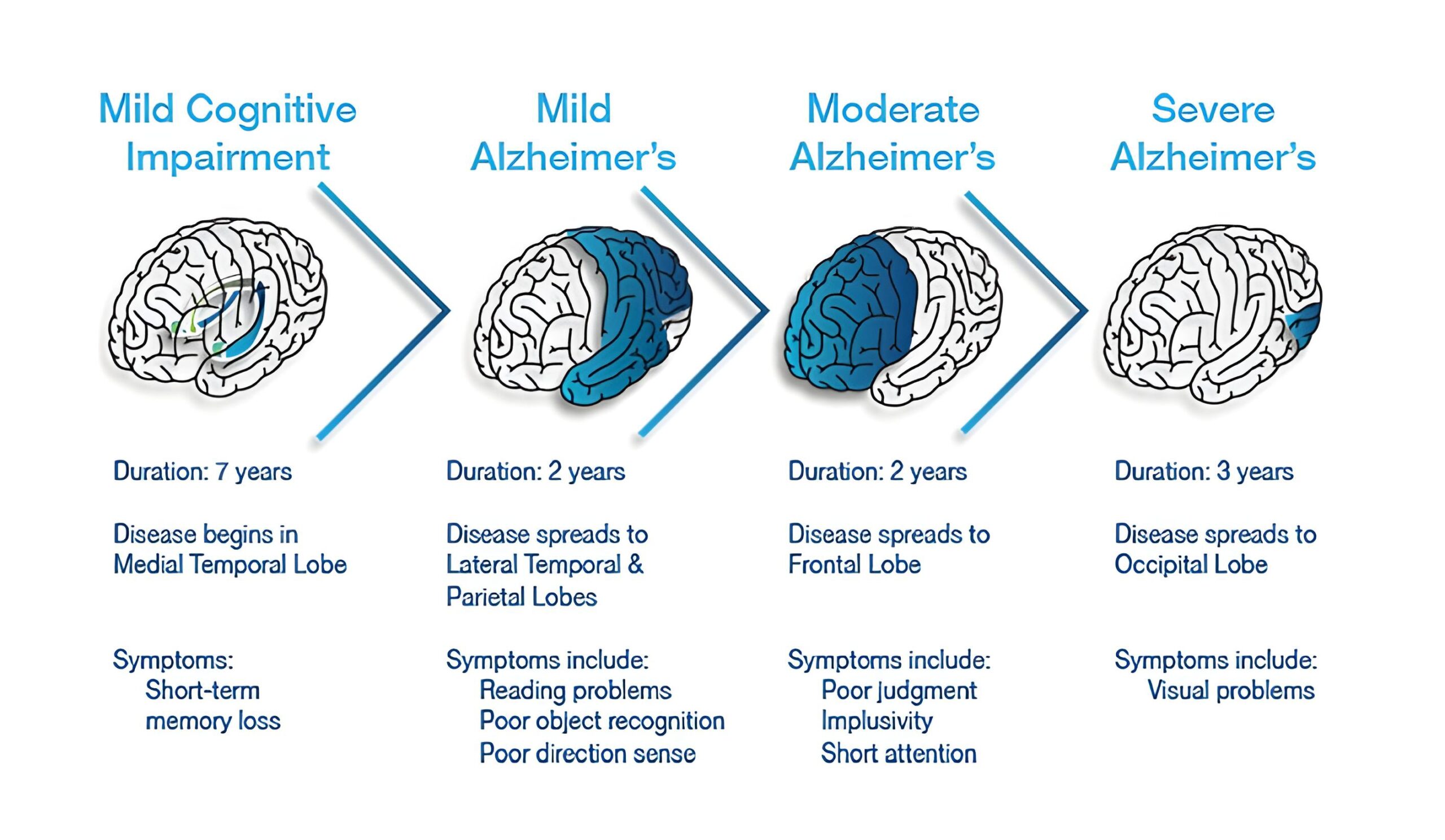 Figure 1. Medical animation shows the affected areas of the brain in each stage of Alzheimer’s disease and the average duration for each stage. Image adapted from: https://seniordirectory.com/articles/info/what-are-the-three-stages-of-alzheimers-disease